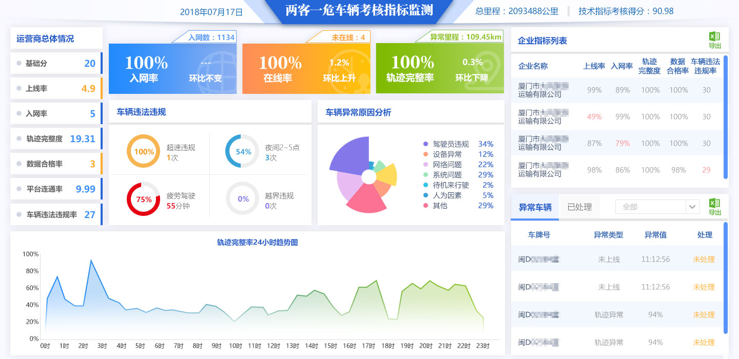 2019年11月,我司在福建省廈門(mén)市建設了廈門(mén)市重點(diǎn)營(yíng)運車(chē)輛行業(yè)監測處置系統,該項目采用統一的車(chē)載終端標準和動(dòng)態(tài)監管平臺,采集全市重點(diǎn)營(yíng)運運輸車(chē)輛數據,將運輸企業(yè)基礎數據和車(chē)輛行駛等動(dòng)態(tài)數據納入監管系統并進(jìn)行綜合處理分析,并接入車(chē)載主動(dòng)安全報警數據,實(shí)現全流程閉環(huán)管理。同時(shí),系統引用省廳考核機制,將共享車(chē)輛違規數據反饋給企業(yè)及運營(yíng)商,以此建立企業(yè)和運營(yíng)商同步指標考核機制,促進(jìn)監管與服務(wù)同步發(fā)展,將單一的管控平臺轉化為監管與服務(wù)一體化的全方位平臺。