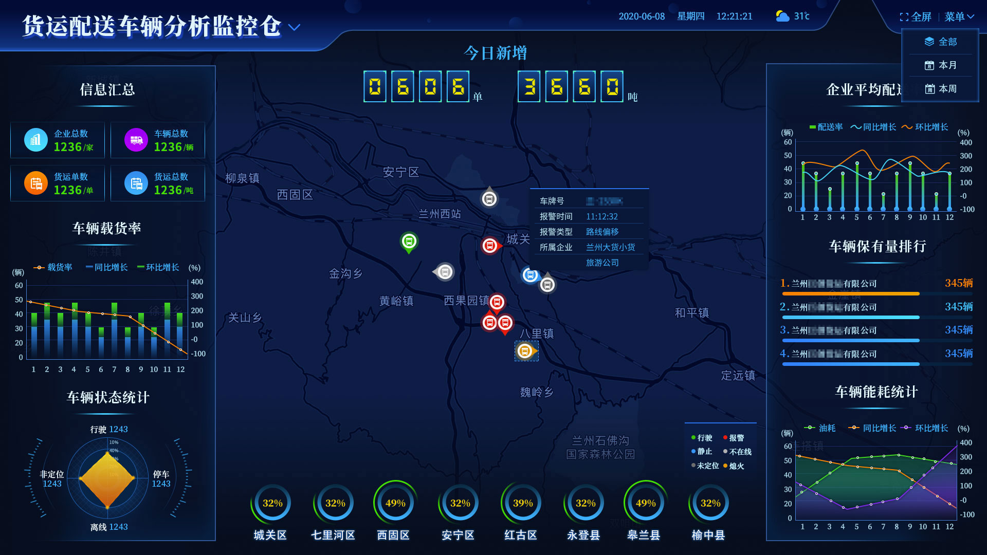 平臺以創(chuàng )建綠色貨運配送示范工程為目標,打造“集約、高效、綠色、智能”的城市貨運配送服務(wù)體系。項目建設過(guò)程中,我司深入蘭州市貨運企業(yè)和相關(guān)部門(mén)進(jìn)行需求調研,創(chuàng )新設計了數據管理與查詢(xún)、車(chē)輛運行監測、貨源發(fā)布與承接、數據分析、數據調度、企業(yè)考核6大功能體系,通過(guò)動(dòng)態(tài)監測、安全預警、統計分析、綜合考評、交易撮合等功能,形成針對城市貨運主體的綜合服務(wù)與閉環(huán)管理,實(shí)現相關(guān)監管部門(mén)對配送企業(yè)的日常監管、績(jì)效考核及企業(yè)對政務(wù)信息服務(wù)的需求,同時(shí)極大提升當地貨運配送行業(yè)整體運行效率、監測精度、行業(yè)服務(wù)能力和管理水平。