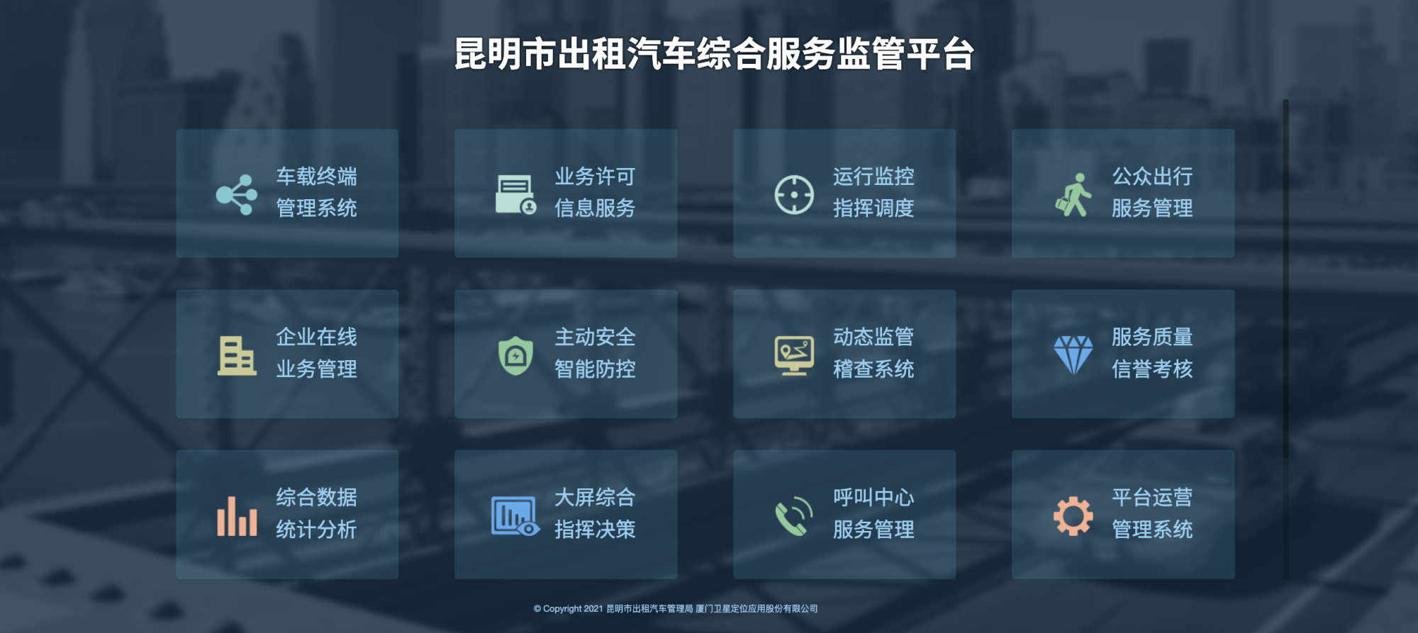 隨著(zhù)昆明市民美好出行需求的提升,以及網(wǎng)約車(chē)新業(yè)態(tài)的出現,昆明市出租汽車(chē)行業(yè)的健康發(fā)展面臨新的問(wèn)題與考驗。為推動(dòng)巡游車(chē)行業(yè)轉型升級、網(wǎng)約車(chē)規范安全、提升行業(yè)服務(wù)品質(zhì),更好地滿(mǎn)足市民群眾和旅游人士高品質(zhì)出行需求,我司于2020年承建昆明市出租汽車(chē)綜合服務(wù)監管平臺,平臺可實(shí)現巡游網(wǎng)約雙業(yè)態(tài)的實(shí)時(shí)監控、動(dòng)態(tài)監管稽查、電召出行、動(dòng)態(tài)調價(jià)、統計分析等智能監管功能,以加強昆明市出租汽車(chē)行業(yè)雙業(yè)態(tài)融合的精細化監管,改善出租汽車(chē)營(yíng)運條件、提高出租汽車(chē)營(yíng)運效率和服務(wù)滿(mǎn)意度,全面助推昆明出租汽車(chē)信息化水平。